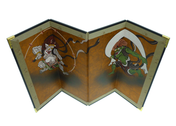 | 風神雷神図屏風 | 17世紀初頭 俵屋宗達 作 京都 建仁寺 蔵 [国宝] 宗達の代表作。遠く鎌倉時代建立の三十三間堂にまつられた、自然の神格化とされる“風神”“雷神”の彫刻を見ての着想と伝えられ、その大胆なスケッチ、恐ろしさとユーモラスさを兼ね揃えた作品ゆえ、国宝に指定される。 そんな名画をシルク印刷で再現することにより、あざやかに“風神”“雷神”の息吹を感じることができる屏風です。 |