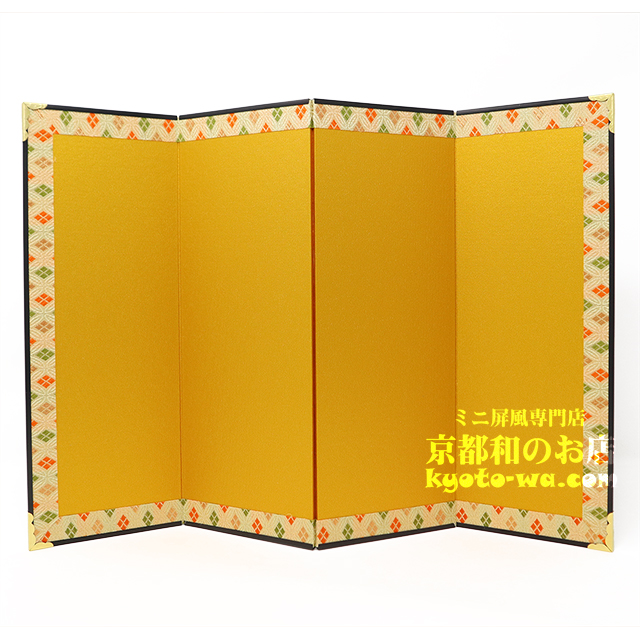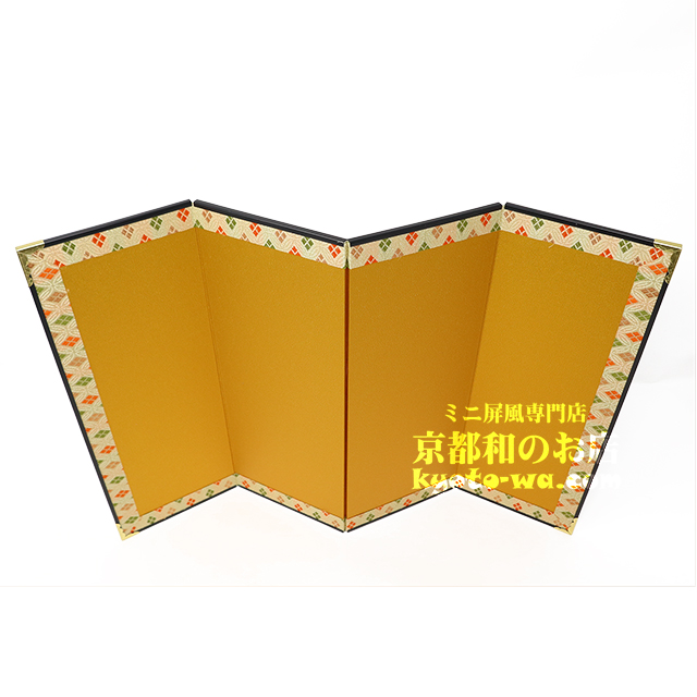| 無地金屏風は、メインとなる置物などのオブジェなどを更に美しくビジュアル的に演出する日本古来の伝統ツールです。.大切なお人形はもちろん、お料理など、どんなモノのバックにでもよく合う無地の金屏風。 是非、この金屏風であなたのお気に入りのモノをお引き立ててください。 布(キレ)は京都西陣金襴地を使用しております。 |